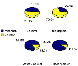 die Fantasy-Spiele kennen, nämlich 29,6% der Befragten, gaben an, Fantasy-Spiele auch zu spielen. Dabei ist der Anteil der männlichen Jugendlichen signifikant höher als der der weiblichen. Nahezu die Hälfte aller männlichen Befragten (47,2%) spielt Fantasy-Spiele, bei den weiblichen Befragten liegt die Quote bei nur 12,5%. Entsprechend sind über 80% der Fantasy-spielenden Jugendlichen männlichen, nur knapp 20% sind weiblichen Geschlechts. Dagegen macht der Anteil der weiblichen Jugendlichen bei den Nichtspielern ca 70%, jener der männlichen nur ca. 30% aus. Ein etwa ähnliches Bild bietet sich bei den Fantasy-Rollenspielern sowie bei der Zusammensetzung der Rollenspielgruppen. Diese Zahlen sind vorsichtig zu bewerten, da die Datenbasis bei den Rollenspielern mit nur 17 Befragten sehr schmal ist.26