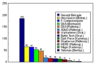 SpielgruppenzusammensetzungWas den Bekanntheitsgrad einzelner Spiele angeht, liegen mit Hero Quest von MB (35,1%) und Das Schwarze Auge von Schmidt Spiele (28,6%) zwei Brettspiele mit den Computerspielen (34,1%)27 in der Spitzengruppe. Auch zu dieser Spitzengruppe gehört als einziges Rollenspiel Das Schwarze Auge von Schmidt Spiele (25,3%), das immerhin einem Viertel der Befragten bekannt ist. Aber auch andere Rollenspiele (AD&D 9,7%, Shadowrun 5,9% und MERS 3,8%) erreichen noch einen gewissen Bekanntheitsgrad. Die Strategiespiele Warhammer (8,6%) und Battletech (8,1%) sind ebenfalls einer beachtlichen Zahl Jugendlicher bekannt, ähnlich das Sammelkartenspiel Dark Force (7%).