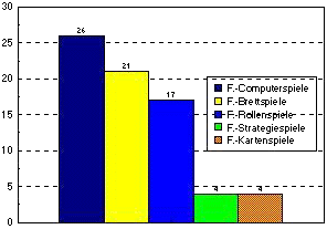 (bei 185 Befragten)Von den befragten 185 Jugendlichen gaben zu der Frage nach eigenem aktivem Spiel 26 an, selbst Fantasy-Computerspiele zu spielen, 21 spielen Fantasy-Brettspiele, 17 Rollenspiele und jeweils 4 Karten- bzw. Strategiespiele.