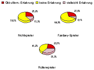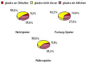 Zuvor möchte ich aber gerne hierzu noch ein weiteres Ergebnis meiner Umfrage vorstellen. Ich habe die Schüler nach ihrer Erfahrung mit Okkultismus (Tisch rücken, pendeln, Schwarze Messen, Geisterbeschwörungen..) sowie danach gefragt, ob sie an solche Dinge glauben. Bei der Frage nach der Erfahrung mit Okkultismus ist der einzige signifikante Unterschied zwischen Nichtspielern, Fantasy-Spielern und Rollenspielern der, daß die Rollenspieler unverhältnismäßig oft unsicher über ihre Erfahrung waren. Diese Unsicherheit bezieht sich vermutlich auf die Spiele selbst. Auf die Frage Glaubst du, daß Rollenspiele okkultistisch sind? antworteten von den 17 Rollenspielern nämlich drei mit ja, vier mit weiß nicht, neun mit nein und ein Spieler machte keine Angabe.