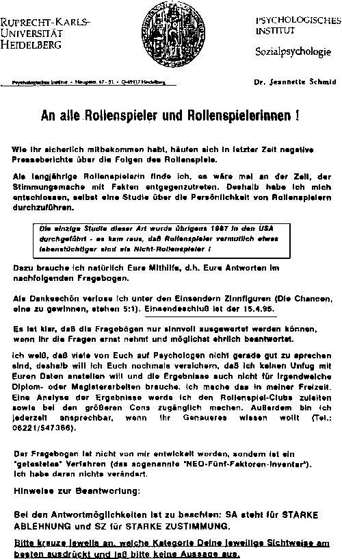 In den Monaten März und April wurde eine psychologische Untersuchung bei Fantasy-Rollenspielern im süddeutschen Raum durchgeführt. Ziel war es, Daten über Persönlichkeitsmerkmale zu erheben.